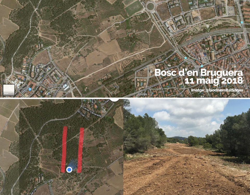 El desenvolupament de la urbanització de La Plana i Santa Bàrbara segueix endavant. Des de Biodiversitat Sitges ens envien unes imatges i un clip de video per a denunciar l’actuació que s’ha fet al bosc d’en Bruguera, i que ha anorreat part de la pineda existent.