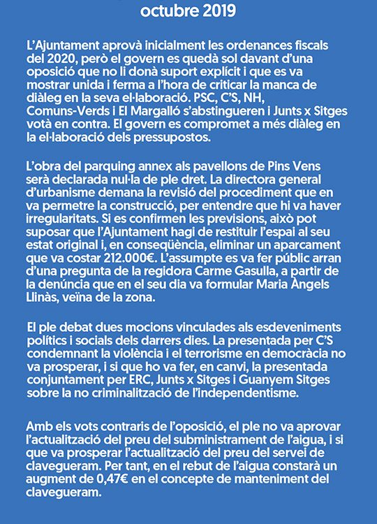 Us oferim, en 3 clips d’àudio diferenciats, el debat de les ordenances fiscals, el de les mocions vinculades als esdeveniments dels darrers dies, proposades per C’S i ERC, Guanyem Sitges i Junts per Sitges, i el de la petició que la directora general d’urbanisme ha fet a l’Ajuntament per a declarar nul de ple dret l’acord de junta de govern pel qual s’aprovava el projecte d’execució del pàrquing annex als […]