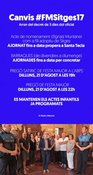 Arran de la declaració de 3 dies de dol, anunciada pel president de la Generalitat de Catalunya la mateixa nit de l’atemptat de Barcelona, l’Ajuntament de Sitges ha modificat el calendari d’actes previs a la Festa Major. L’alcalde Miquel Forns ha manifestat la condemna unànime de la corporació a l’atemptat, el suport a les víctimes, i el reconeixement als cossos de seguretat per la seva labor durant aquestes hores d’especial complexitat. Pel que fa als actes previs de la Festa Major, es suspèn la sessió de ple del nomenament d’Ignasi Muntaner com a fill adoptiu, i l’oferta musical de les Barraques que havia de començar avui i acabar diumenge. Per als dos esdeveniments es buscaran noves dates. Pel que fa al pregó de la Festa Major, s’ajorna al proper dilluns 21 d’agost, a partir de les 22h. Es mantenen els actes infantils ja programats, excepció feta de la festa infantil que havia de tenir lloc diumenge al matí als jardins del Retiro, i que també queda anul·lada. El cine-club Sitges també ha comunicat que se suspèn la projecció de La la land en versió sing along, prevista per aquest diumenge a l’Hort de Can Falç. Es retornaran els diners de totes les entrades.