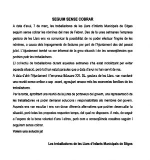 S’està a l’espera del resultat d’una reunió important demà al migdia, que pugui donar una solució definitiva al conflicte obert entre l’Ajuntament i l’empresa gestora de les llars d’infants, que ha desembocat en l’impagament de les nòmines de febrer a les treballadores, i amb l’advertiment de l’empresa de deixar la gestió dels equipaments el proper 16 de març si les coses no es resolen. Mireia Vericat, en representació del col·lectiu de mares i pares dels centres, ha mostrat aquest matí el seu suport incondicional a la feina de les educadores, que ha qualificat d’espectacular, i ha demanat garanties més enllà de l’acció puntual que pugui posar en marxa l’Ajuntament per a pagar les nòmines del mes de febrer. Per la seva banda, la directora de La Moixiganga, Mari Carmen Ortega, ha confessat que les treballadores estan cansades de viure en aquesta mena d’estat de tensió permanent, des que el 2011 es produí l’episodi de la retirada dels 300€ que l’Ajuntament aportava al seu sou, i demana una solució definitiva al problema, tot confessant que en varen ser coneixedores el passat 16 de febrer, malgrat que el desacord entre empresa i Ajuntament, causant de la situació actual, es remunti al mes de juliol del 2016.